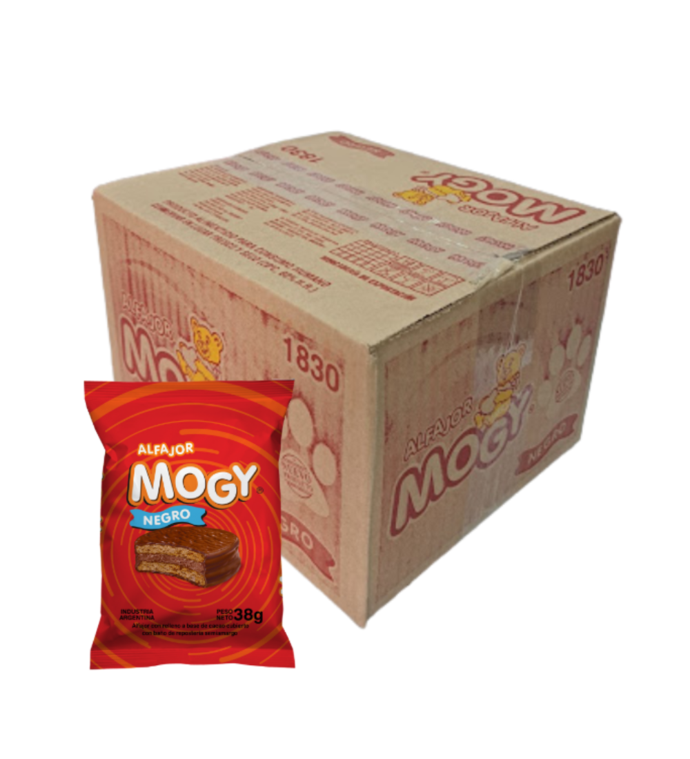 ¡Abastecete con el alfajor Mogy Negro en esta caja de 40 unidades! Ideal para tu negocio, para eventos, cumpleaños o simplemente para tener siempre a mano un rico alfajor. Su sabor clásico a chocolate y su textura suave lo hacen perfecto para cualquier ocasión. ¡Un alfajor rendidor y delicioso! Perfecto para compartir con amigos, familiares o clientes.