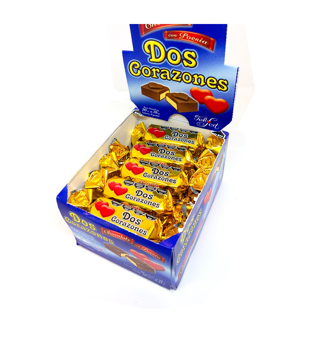 Chocolate Dos Corazones, el clásico chocolate para regalar un mensaje de amor y amistad. Cada unidad viene con una frase especial para compartir con esa persona especial. Ideal para regalar en cumpleaños, aniversarios o simplemente para demostrar tu cariño. Este pack de 20 unidades es perfecto para tener siempre a mano un detalle dulce y significativo. ¡Compartí amor con Chocolate Dos Corazones!
