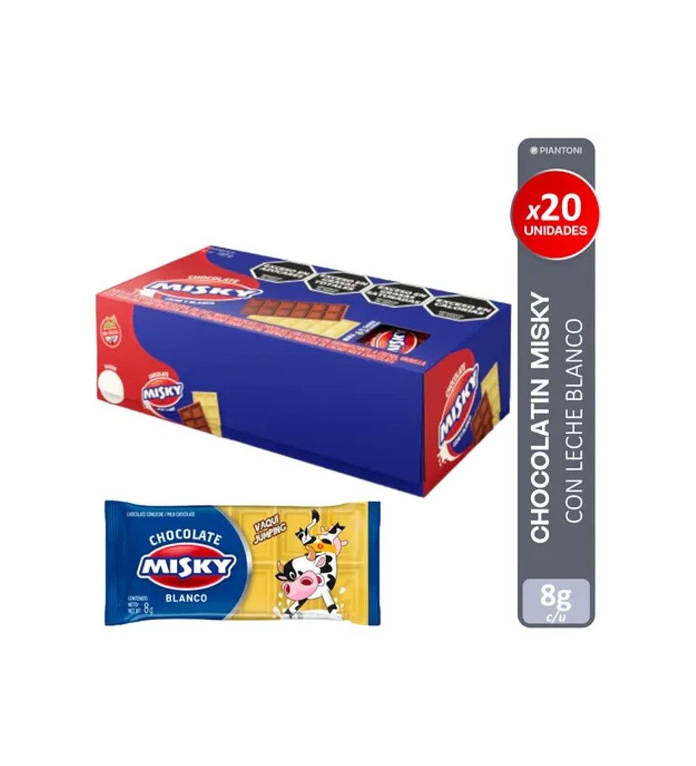 Disfrutá del irresistible chocolate blanco Misky en este práctico pack de 20 unidades.