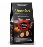 Almendras cubiertas con chocolate amargo, un snack sofisticado y delicioso en un paquete de 80 gramos.