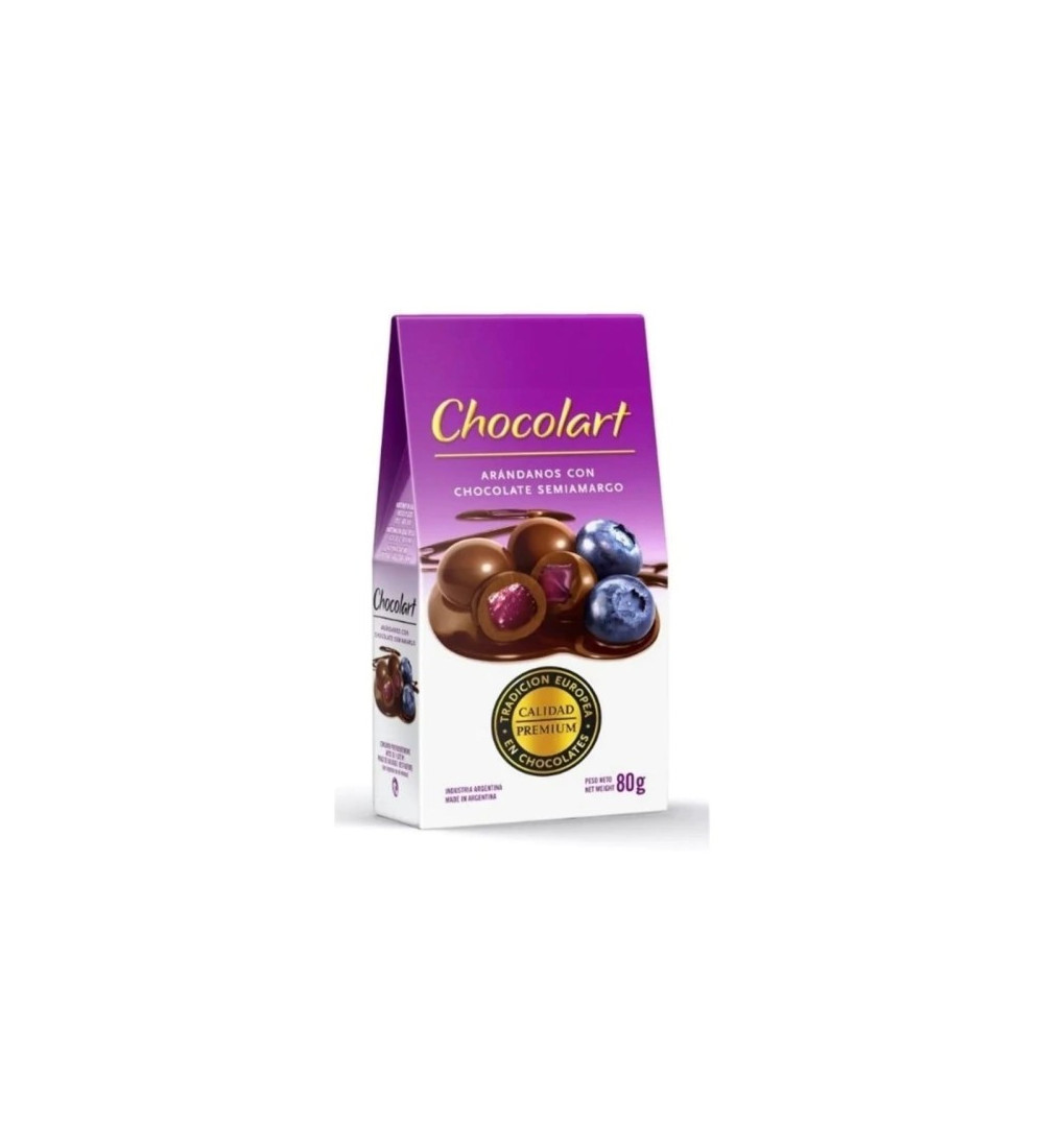 Descubre la exquisitez de los Arándanos con Chocolate Semiamargo de Chocolart, presentados en un práctico envase de 80 g