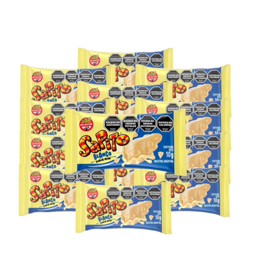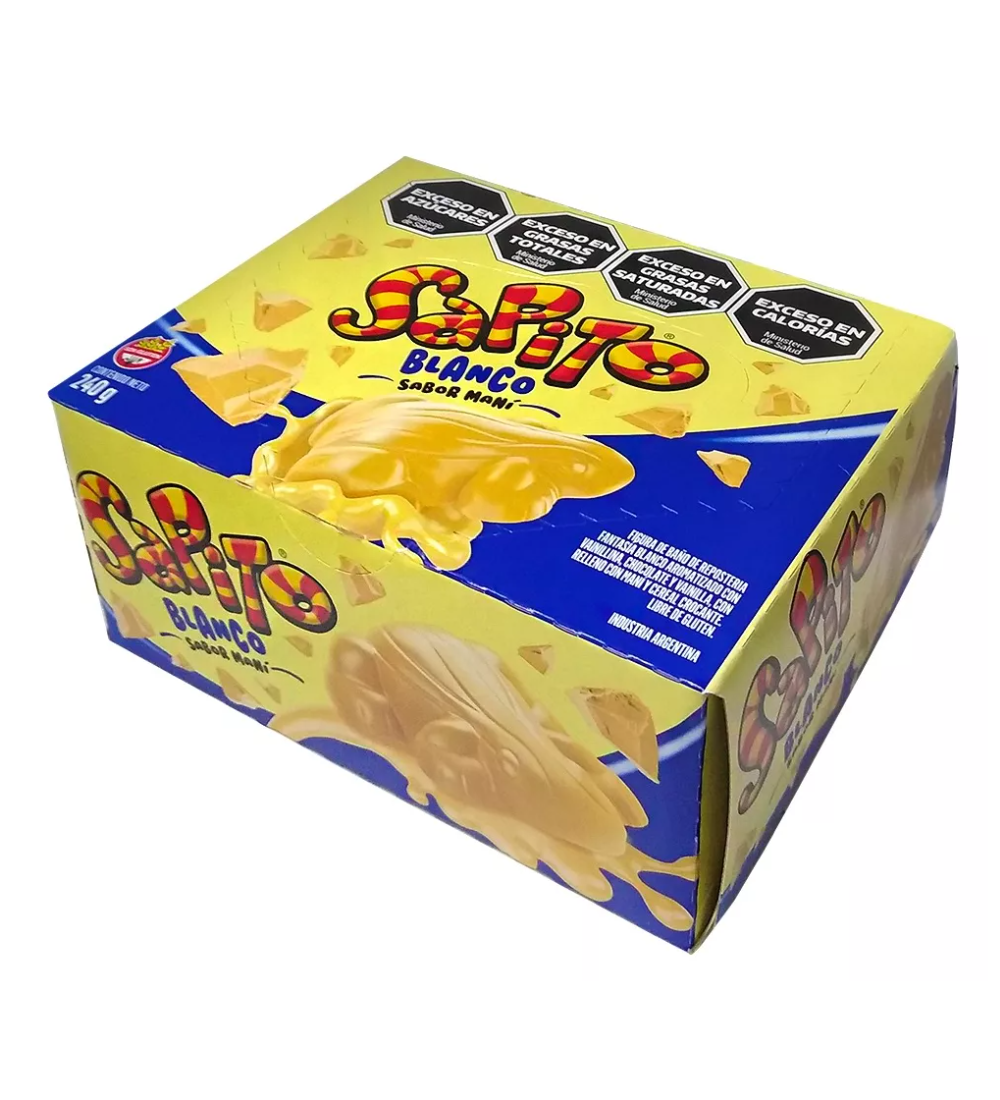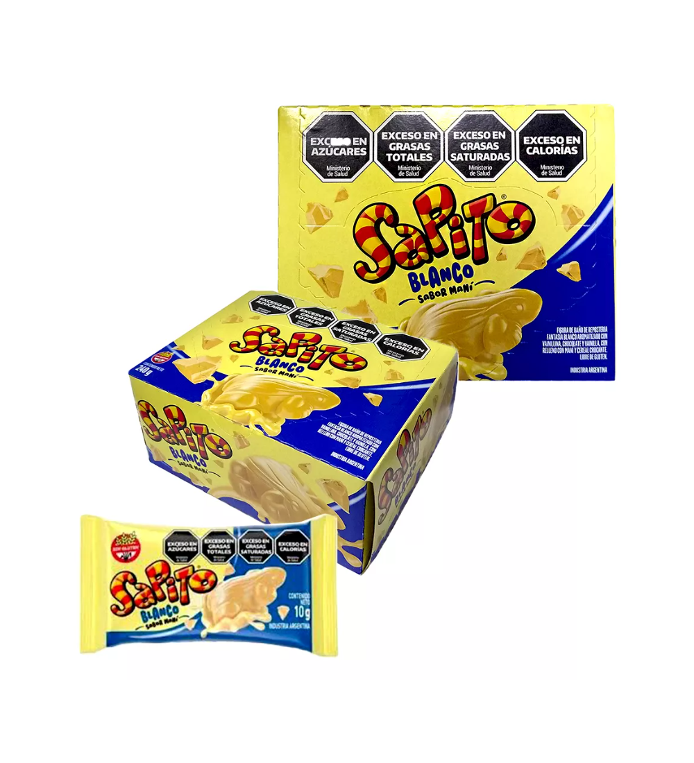 Chocolate Sapito Blanco, el clásico sabor que te transporta a tu infancia, ahora en caja de 24 unidades.