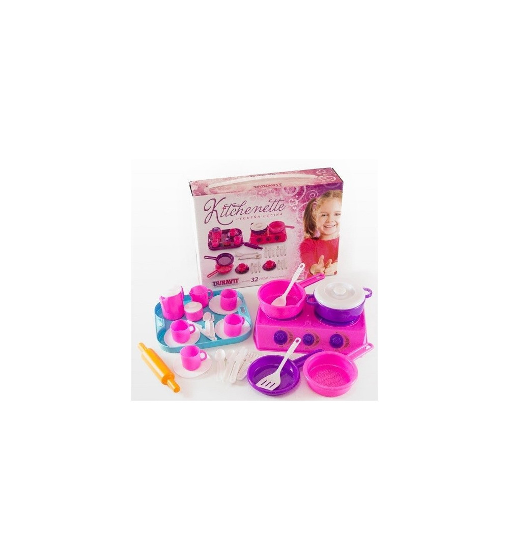 Kitchenette de 32 piezas en caja, ideal para que los niños jueguen a ser chefs.