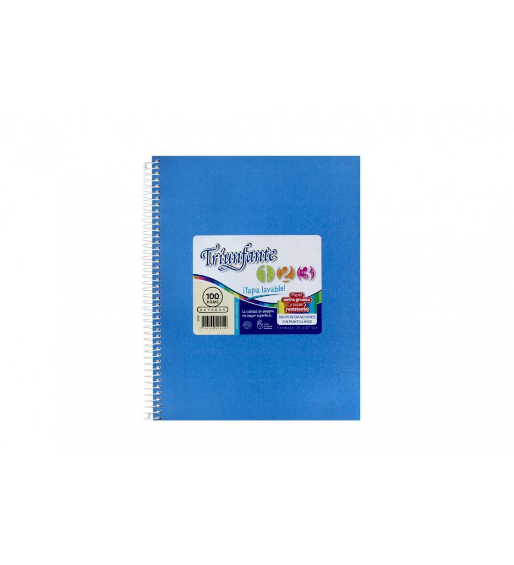 Cuaderno Triunfante 123 Vinil celeste de 100 hojas rayadas, ideal para estudiantes y profesionales.