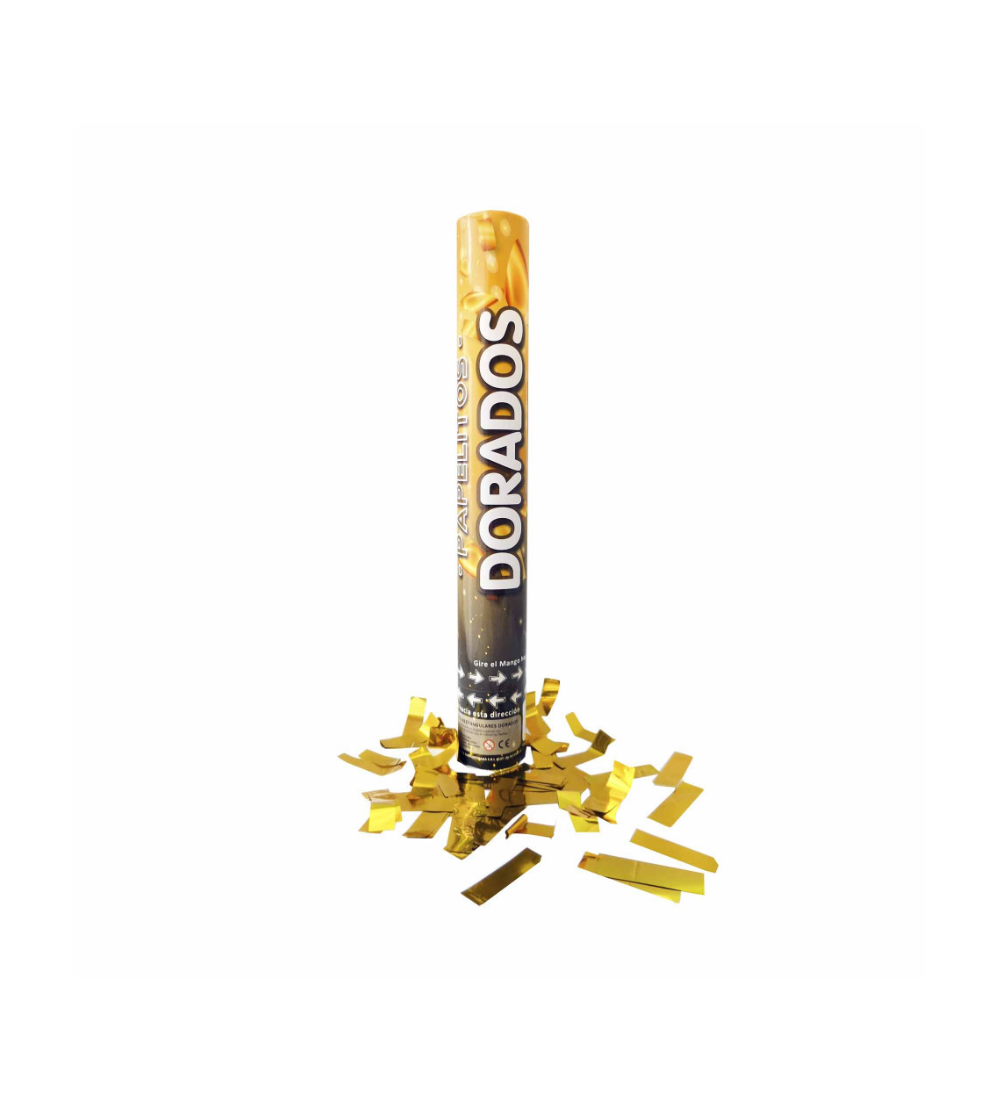 Lanza papelitos dorado metalizado, perfecto para agregar glamour y sofisticación a tus celebraciones.