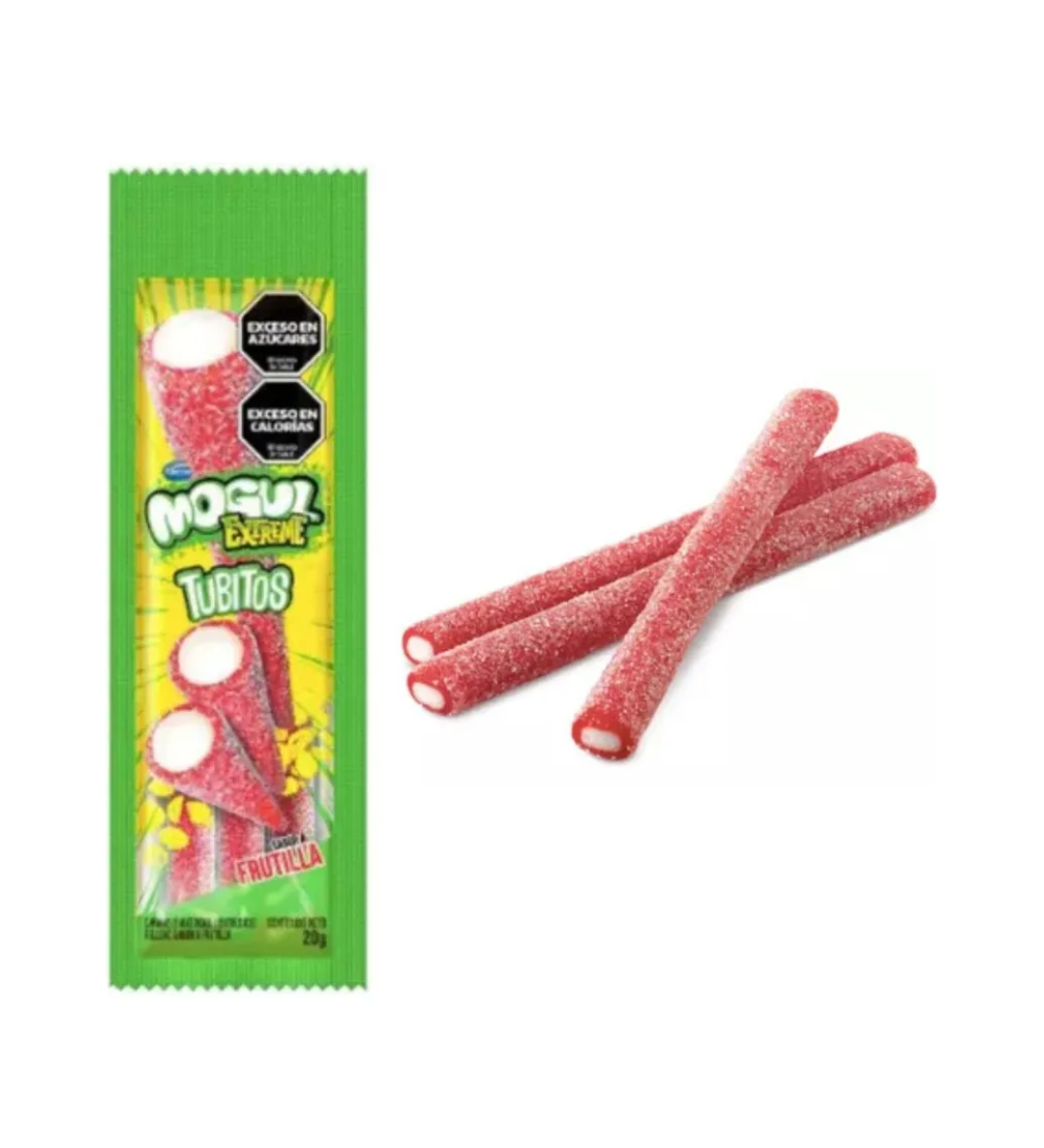 Tubitos Mogul Extreme Frutilla, gomitas con sabor intenso para disfrutar y compartir.