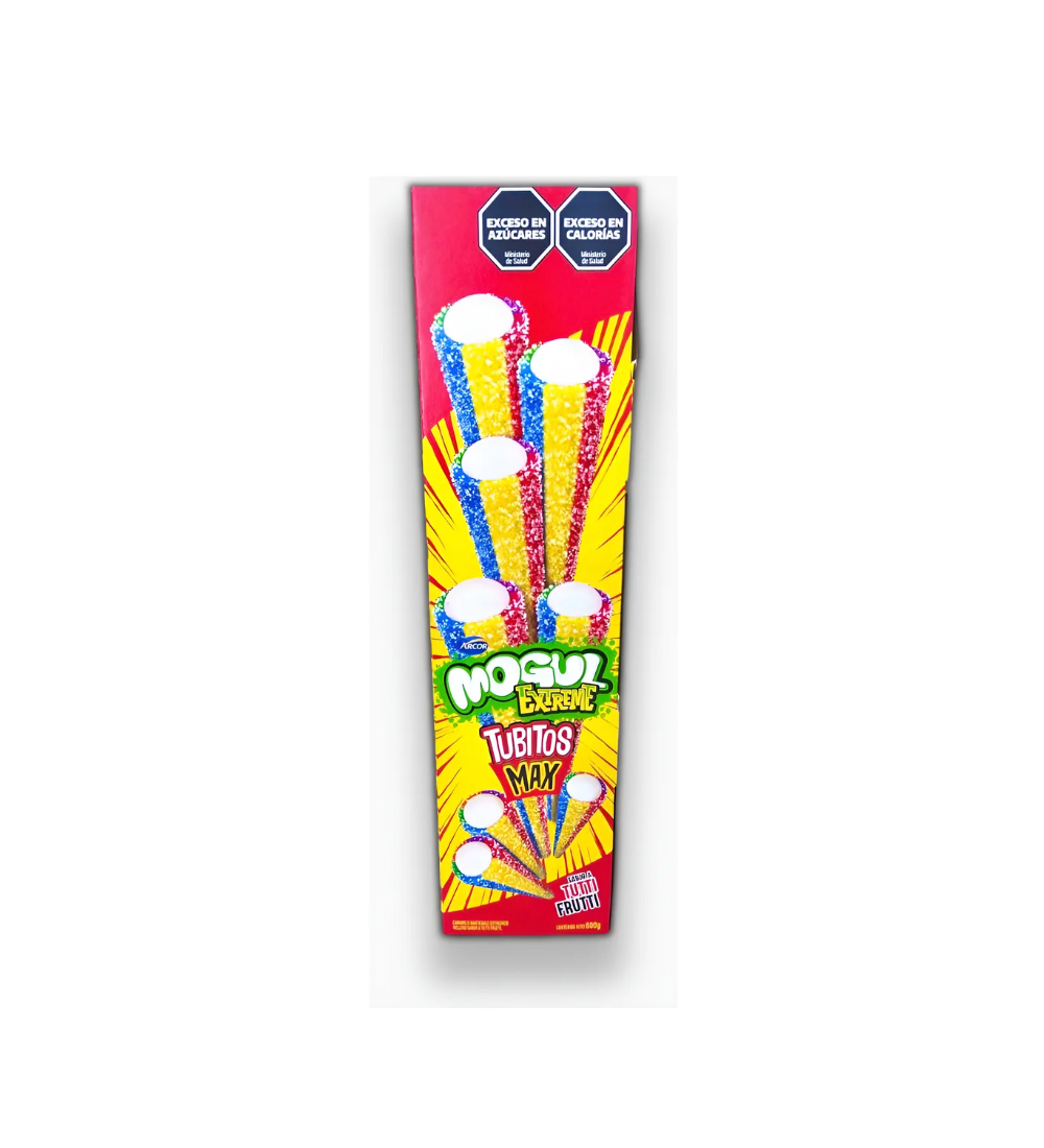 Gomitas Mogul Extreme Max Tutti, una explosión de sabores frutales en un práctico display de 24 unidades.