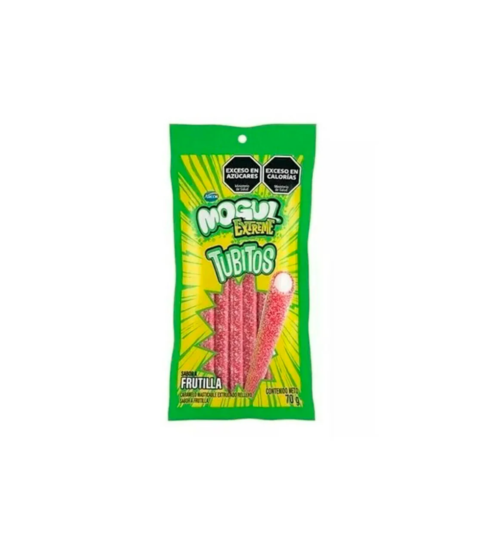 Gomitas Mogul Tubito Frutilla, el delicioso sabor a frutilla en una divertida forma de tubito.