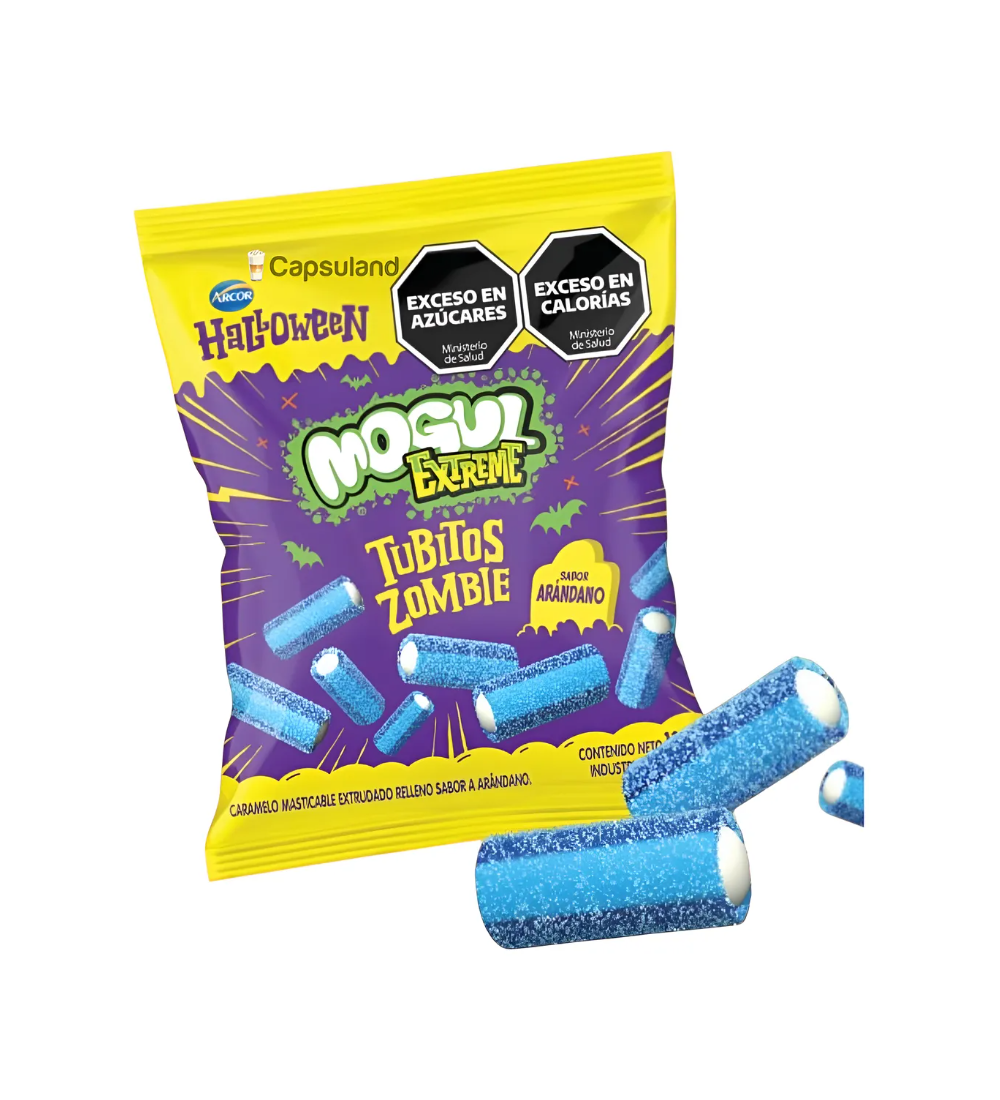 Gomitas Mogul mini con forma de tubito y sabor zombie, ideales para Halloween y momentos divertidos.