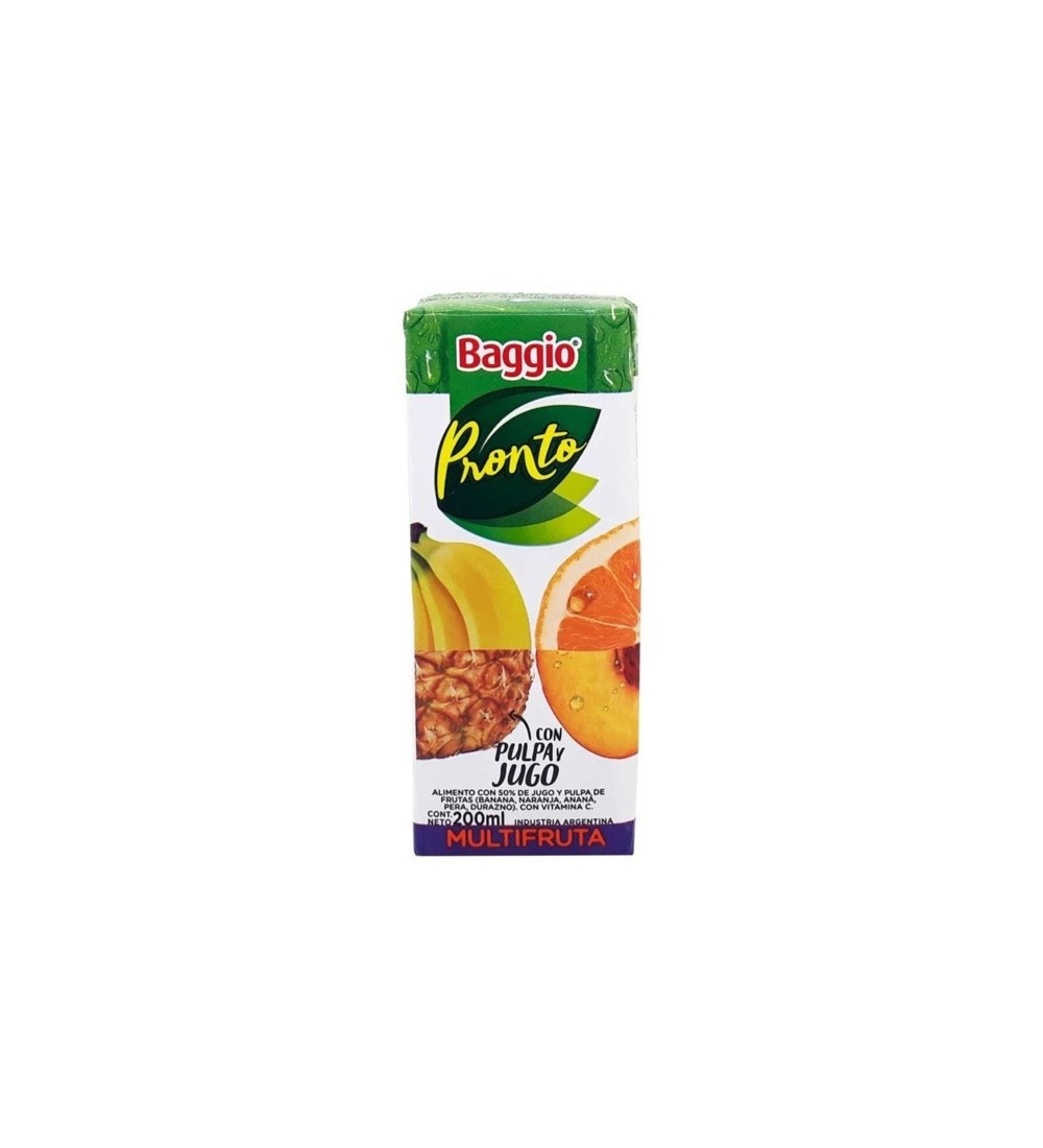 ¡La combinación perfecta de frutas en un solo jugo! Este pack de 18 jugos Baggio Pronto Multifruta es la opción ideal para refrescarte con una mezcla deliciosa. Llevá la practicidad y el sabor a tus comidas, meriendas o para disfrutar en el trabajo o la escuela. ¡Compartí con amigos y familia este mix que nunca falla! También es una excelente opción para ofrecer en tu negocio.