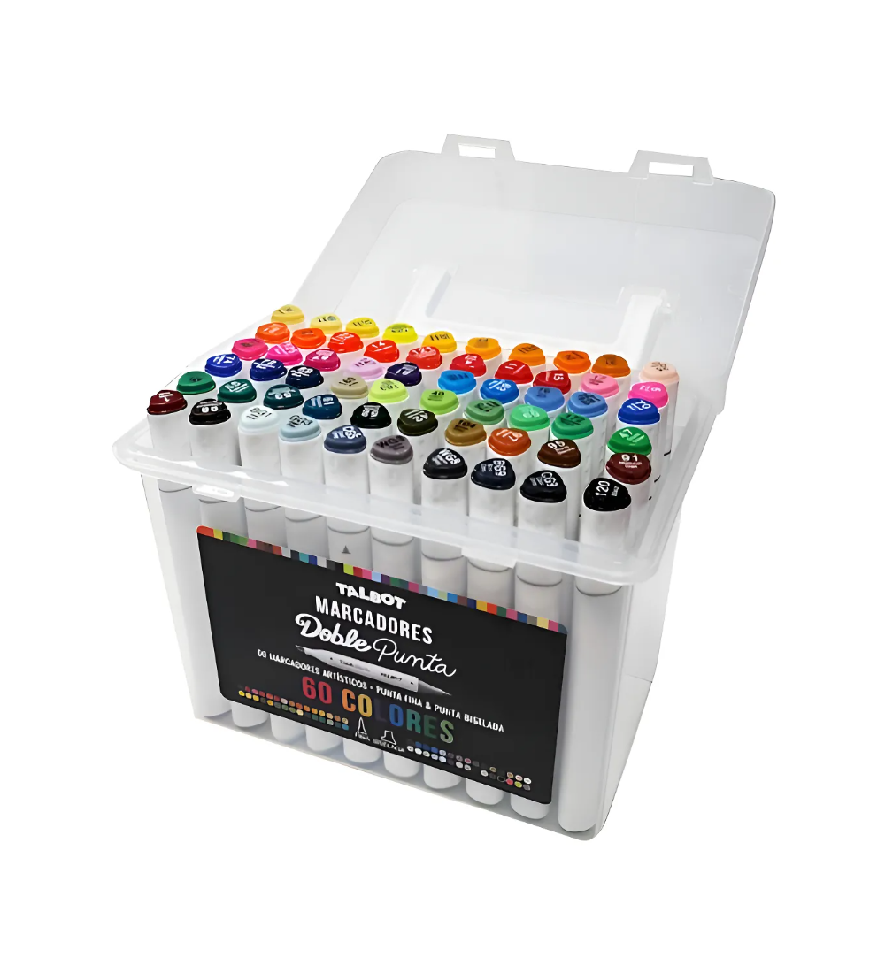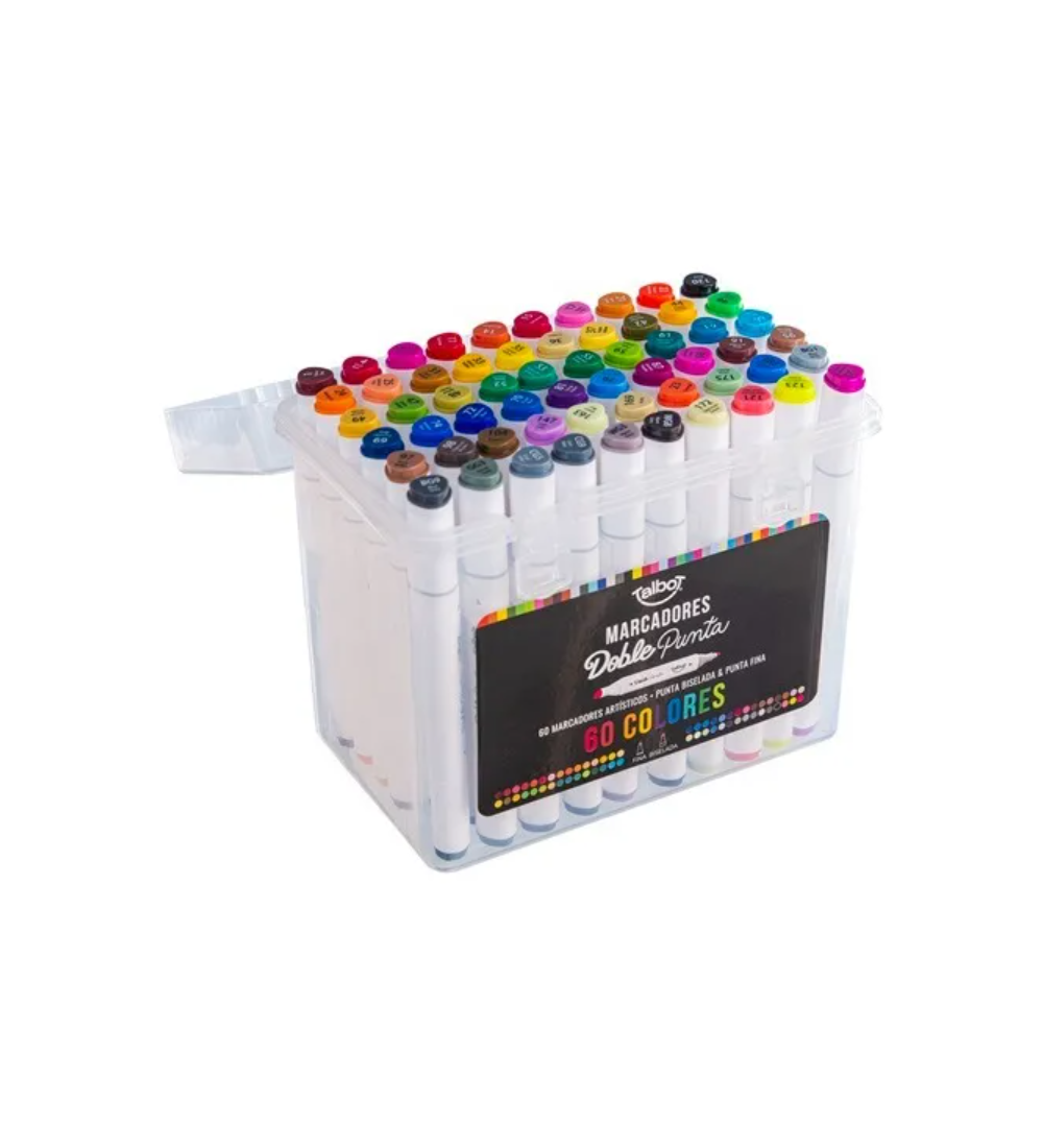 Llevá tu arte al máximo nivel con este set de 60 marcadores Talbot de doble punta. Con una gama de colores amplia y vibrante, y dos puntas diferentes para cada marcador, tenés infinitas posibilidades para crear. Su tinta permanente de secado rápido es ideal para trabajar sobre papel, cartón, madera, tela y más. Perfecto para artistas profesionales, ilustradores, diseñadores gráficos o cualquier persona que quiera un set de marcadores completo y de alta calidad. ¡Este set es la herramienta definitiva para tu creatividad!