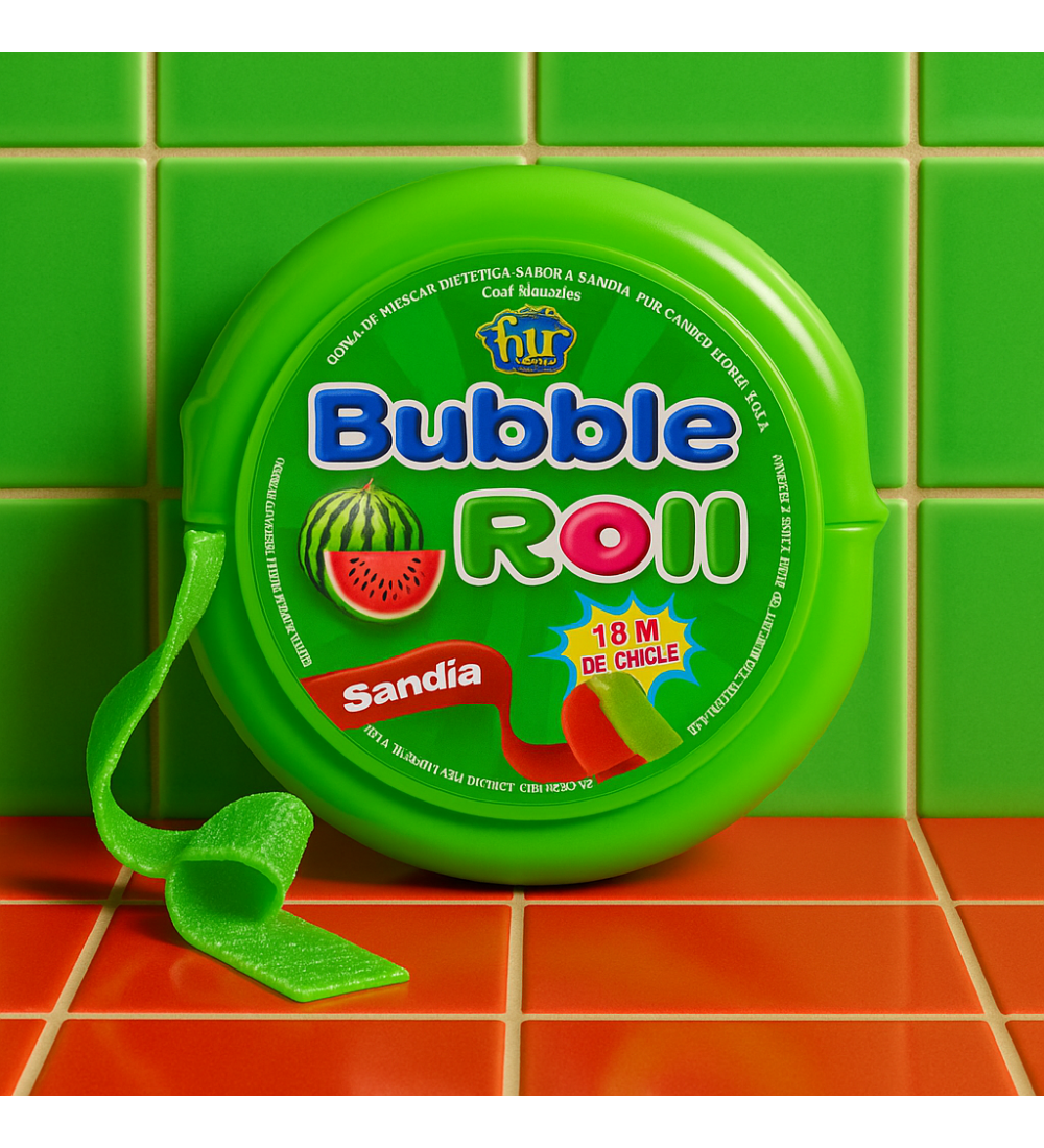 Chicle Bubble Roll Fun es una goma de mascar dietética de 1.8m de largo, el verde es sabor Sandía y el Azul es sabor Frambuesa. Esta es una de las golosinas mas populares de los kioscos! Viene en un estuche de plástico, tipo cinta métrica pero que contiene 1.80m de chicle, para recortar las medida que prefieras, también viene con un gancho para que lo cuelgues en tu pantalón, mochila o donde prefieras y puedas llevar a todas partes!