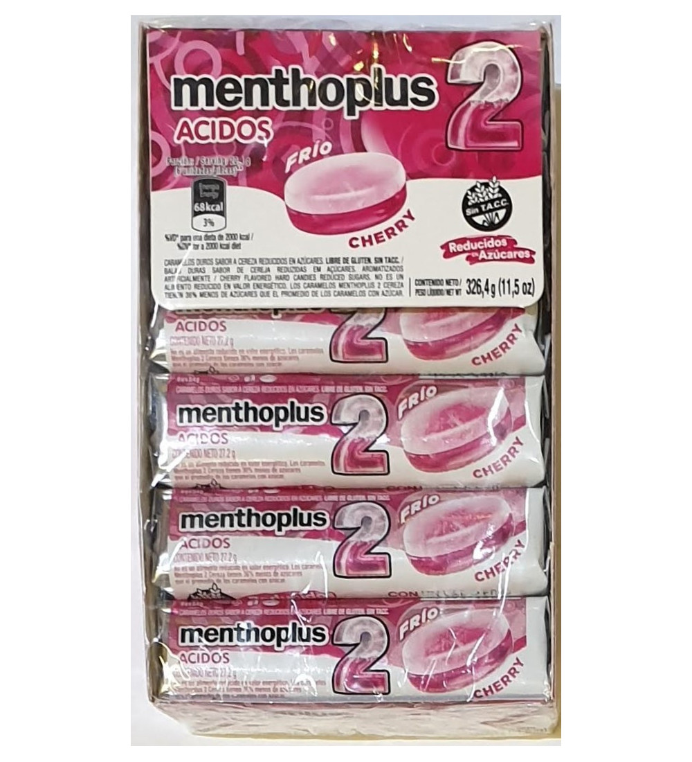 Pastillas Mentho Plus Ácidos Cereza, refrescantes y con un delicioso sabor a cereza.