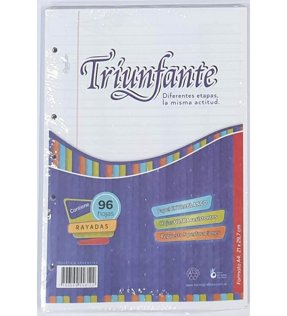 Repuesto Triunfante A4 de 96 hojas rayadas para tus carpetas y cuadernos.