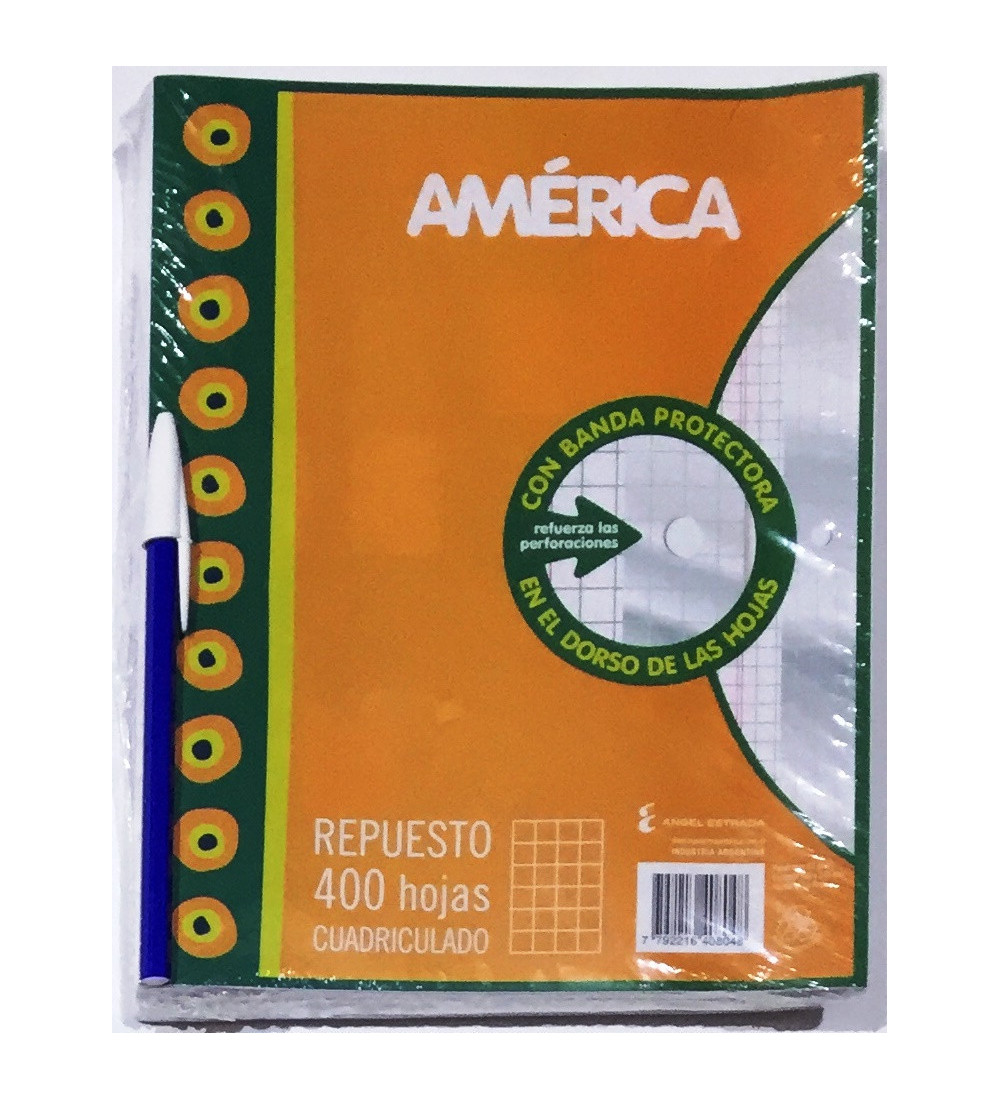 Repuesto de 400 hojas cuadriculadas América, ideal para estudiantes y profesionales.