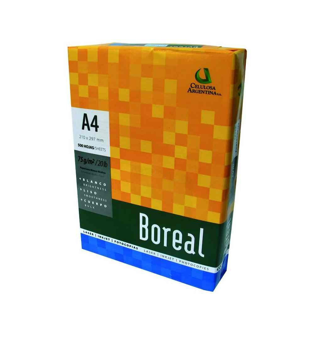 Resma Boreal A4 de 75 gramos, ideal para imprimir documentos con calidad y confianza.