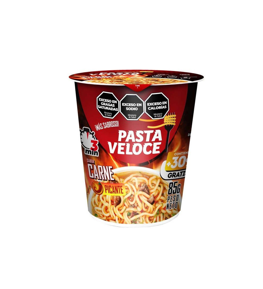 Pasta Veloce sabor Carne en Vaso, la opción perfecta para una comida rápida y práctica en cualquier lugar. Su formato en vaso la hace ideal para llevar y consumir fácilmente. Ideal para estudiantes, trabajadores y cualquier persona que necesite una comida al instante. Ofrece a tus clientes una solución conveniente y sabrosa con este plato listo en minutos. Un producto ideal para la reventa en kioscos, almacenes y estaciones de servicio.